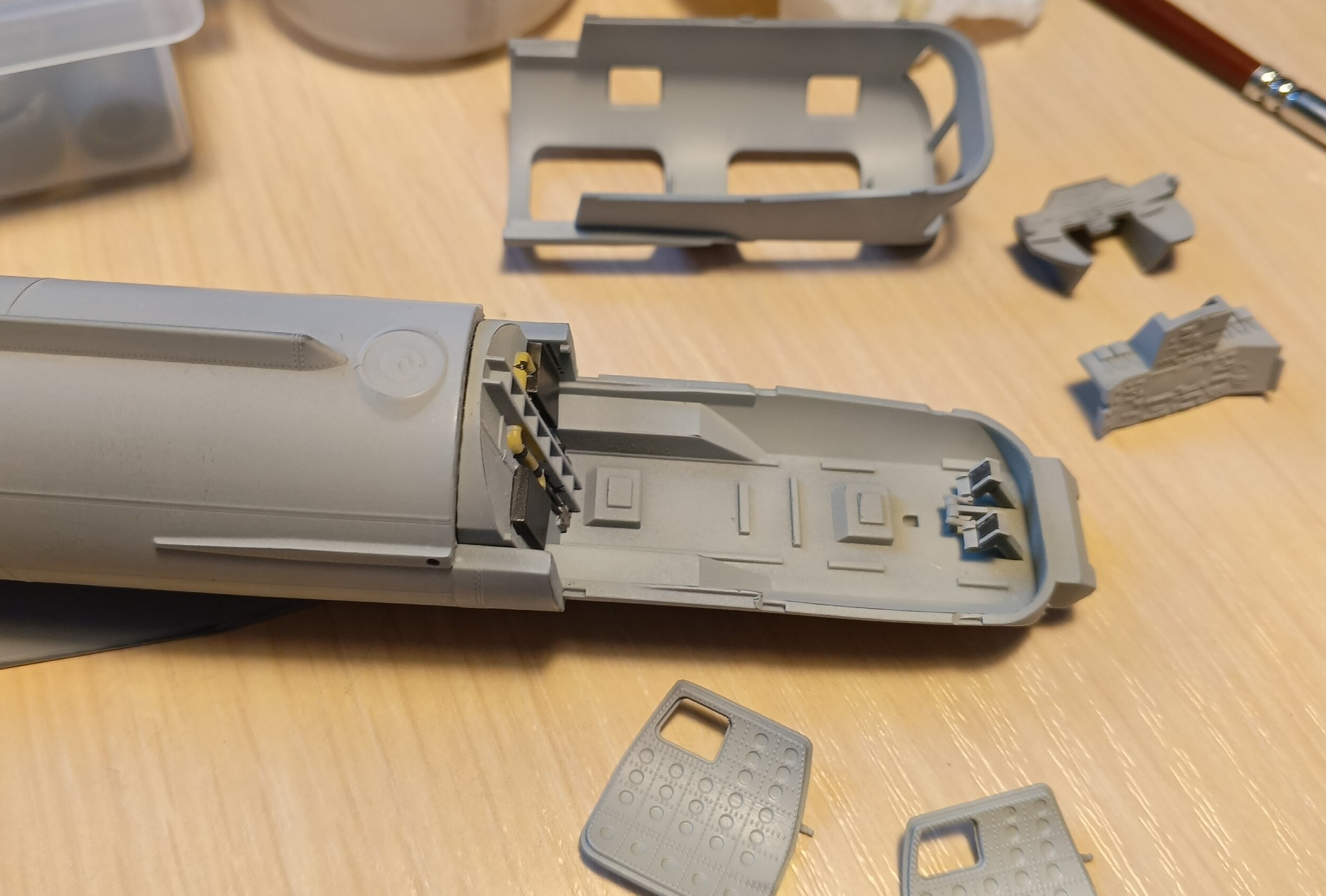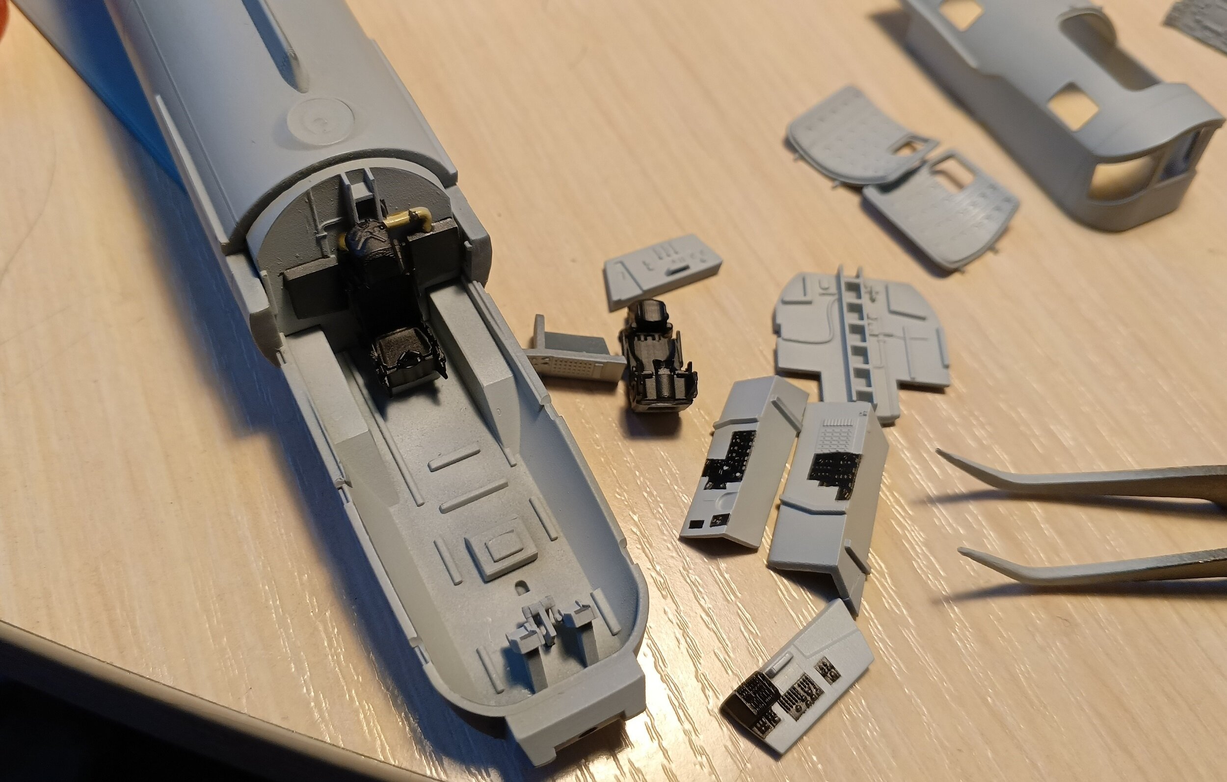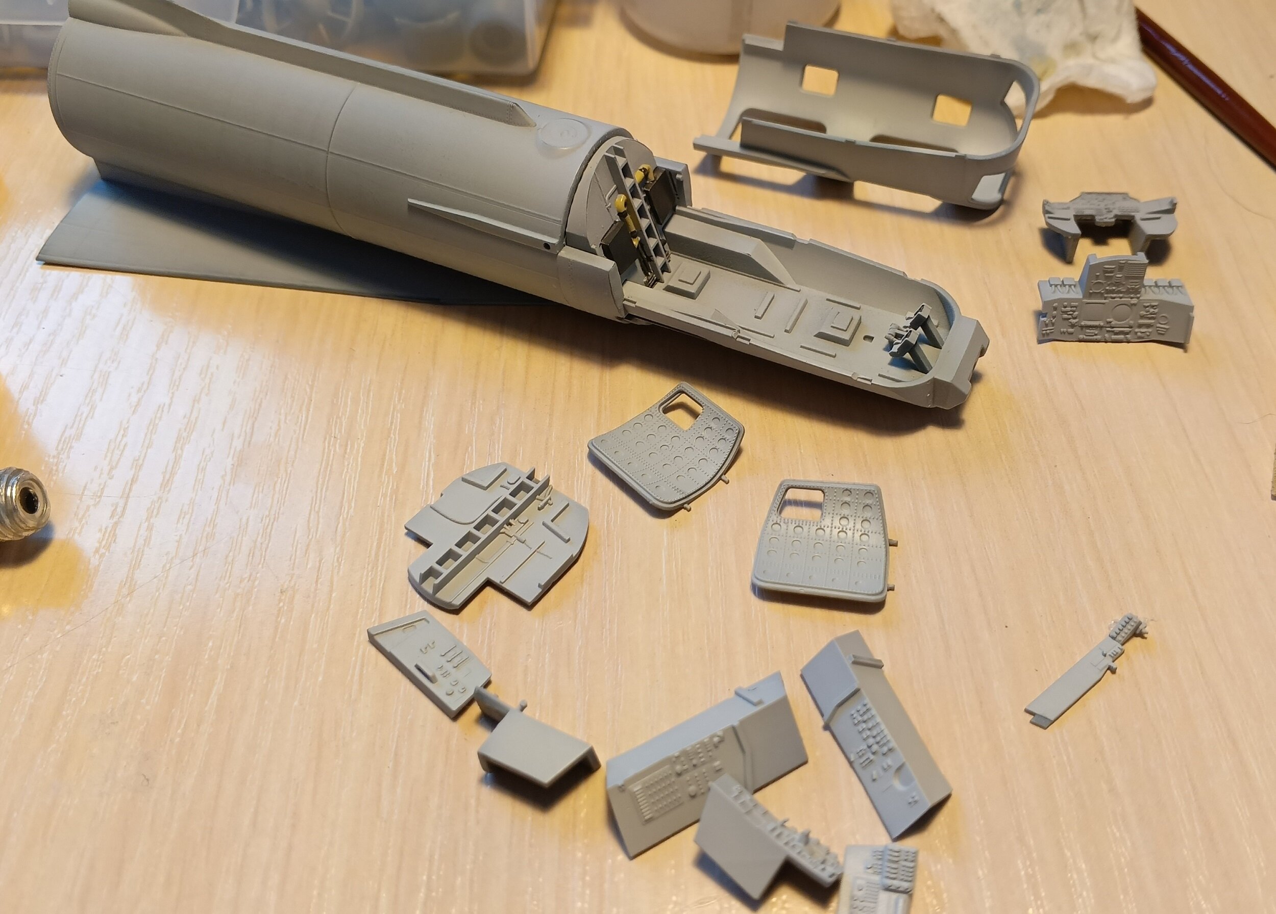 Александр начал стройку неделю назад, и уже прилично ушел вперед)) Начал он с кабины, и у него были готовые декали, что сильно упростило ему задачу. Я в свою очередь поленился и не купил эти декали, и теперь вынужден начать стройку с росписи досок членов экипажа. Фактически только сегодня, с создания этой темы, я начал непосредственно стройку. Но зато у меня все детали уже подготовлены к сборке.
