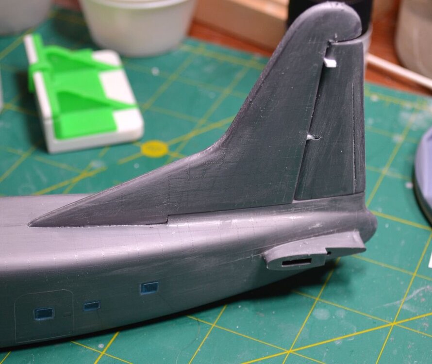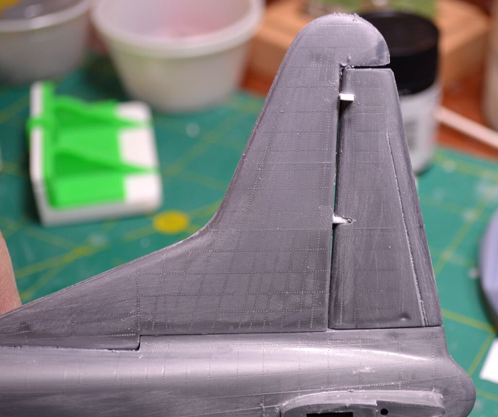 2. Пора переходить от внутренних "сусликов" к внешним. Пока сохнет крыша грузового отсека решил приклеить хвост. И что вы думаете? Тут опять - ПЕТЛИ! На сей раз - петли навески руля направления, которые очень хорошо видны на всех фотографиях, но в модели просто отсутствуют. Пропилил руль, приклеиваю полоски пластика, потом буду выводить форму..