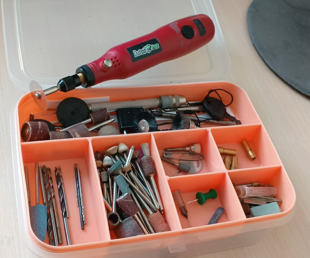 С точки зрения технологии все очень банально. И с минимальным использованием электроинструмента. Фактически, если не считать, компрессора, то только вот это. Насадки в зависимости от задачи подбирал чисто по опыту. Ну и самые первые, которым наверно уже лет двадцать, для самых тонких работ. Зубоврачебные боры. А в ручную это наждачкой с водичкой. Вот и все.