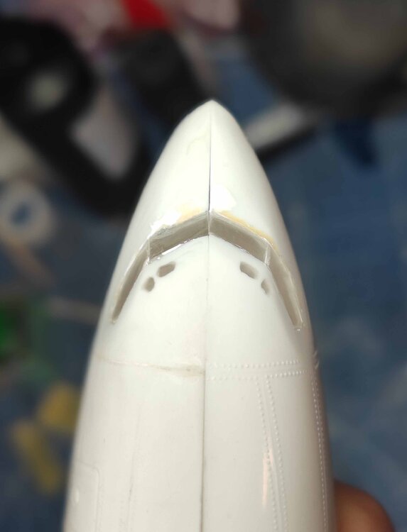 А теперь надо отбить ровненько границу нижнего и верхнего blue. Не сказать, что супер-сложно, но вот эти наплывы ниш шасси, по которым граница тоже должна пролегать, источник напряга нервных клеток. И вот пара моментов перехода маскировочного скотча с фюзеляжа на поверхность наплывов и обратно - скотч фиксируется в ложбинах буквально десятки секунд, в одной руке аэр, пальцами другой жмём на "ямочки" со скотчем