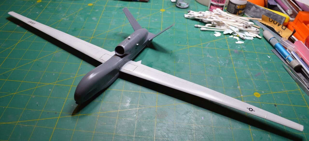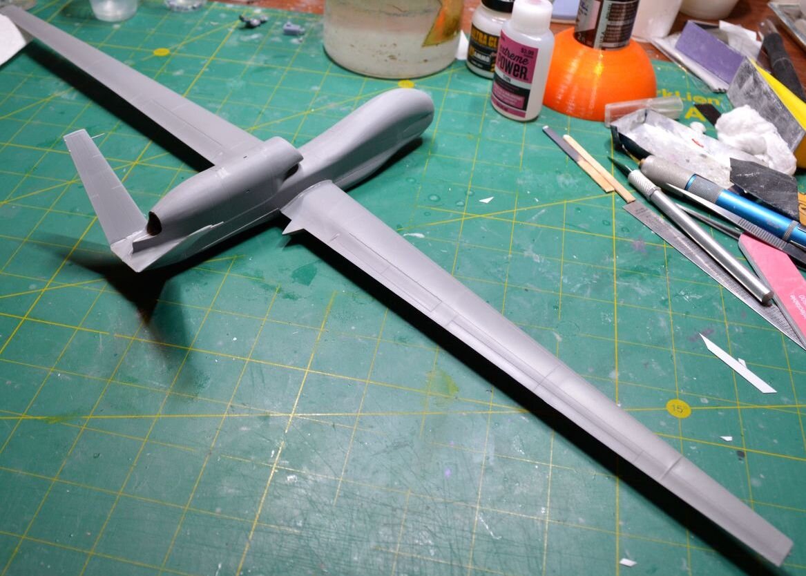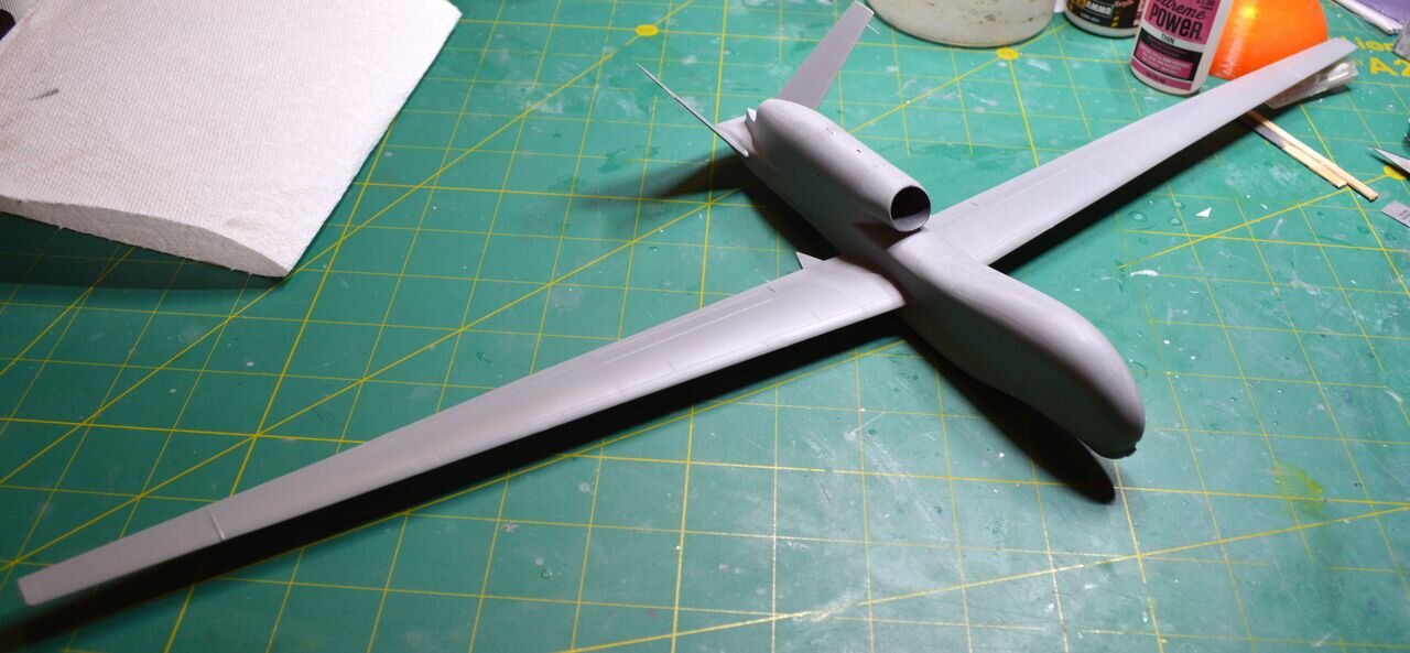 2. Многие из вас помнят что в прошлом году мне удалось побывать в авиационно-космическом музее в штате Орегон где стоит "сосновый гусь" H-4 (на самом деле он - березовый!). Во втором корпусе этого музея, прямо над SR-71 и F-117 под потолком висит этот самый "аЕроплан", увидев который моя жена сказала "Ой, кашалотик! Он мне нравится!" Ну раз жене что-то понравилось, то надо сделать модельку этого беспилотника. Поискал по сети - заказал подешевле из самой Японии! (знал бы как получится дальше, покупал-бы подороже здесь). Коробочку получил довольно быстро и сразу-же после Super Frighter'а захотелось просто что-то собрать по быстрому из коробки. Пластик вроде на первый взгляд красивый, с аккуратной расшивкой и "клепкой", но при ближайшем рассмотрении оказалось что почти на всех крупных деталях просто ужасные утяжины Так что над пластиком пришлось поработать ДО сборки. Сборка трудностей не вызвала - все детали сходятся неплохо. Было несколько "непонятных" моментов по поводу членения деталей, но это оставим на совести у производителя. Деталей в модели мало, сборка прошла быстро. А вот с покраской пришлось "почесать репу" - по неизвестным мне причинам ассортимент красок от Gunze (Mr Color) в магазинах дико уменьшился и приобрести необходимую краску не получилось. Ни у одного продавца в тот момент (сегодня не проверял) требуемой серой краски не было. Пришлось поехать в магазин в надежде найти нужный цвет от другого производителя, но и там меня ждал облом - нужного увета не нашлось. Пришлось брать более темный серый цвет от AK (Real Color) и бодяжить дома самому что-то более-менее (надеюсь!) похожее. Жена сказала что модель надо делать в полетной конфигурации, что я с радостью сделал - при размахе крыла модели в 55 см тоненькие стойки шасси снести - нефиг делать! Да и груз в нос я забыл положить Из "самодеятельности" - только стекатели статики. Производитель отлил в пластике утолщения на законцовках крыльев и килей, и все! Пришлось приклеивать проволочки. Встык увы не получилось, пришлось делать внахлест. Сейчас думаю какую сделать подставку. Что посоветуете?