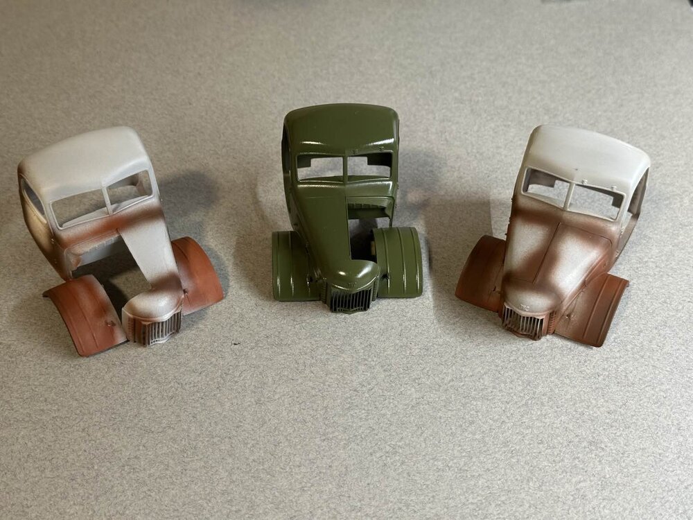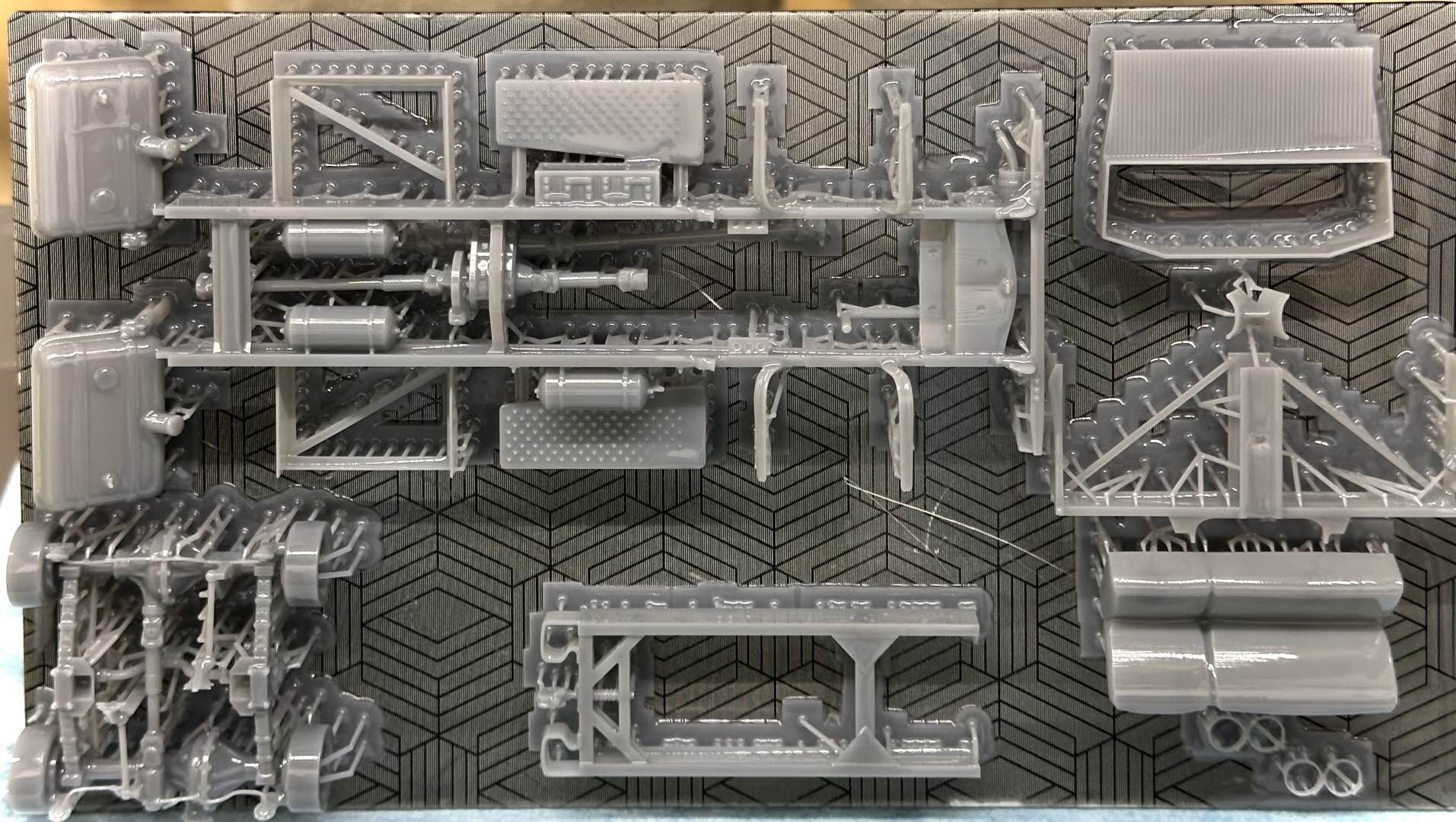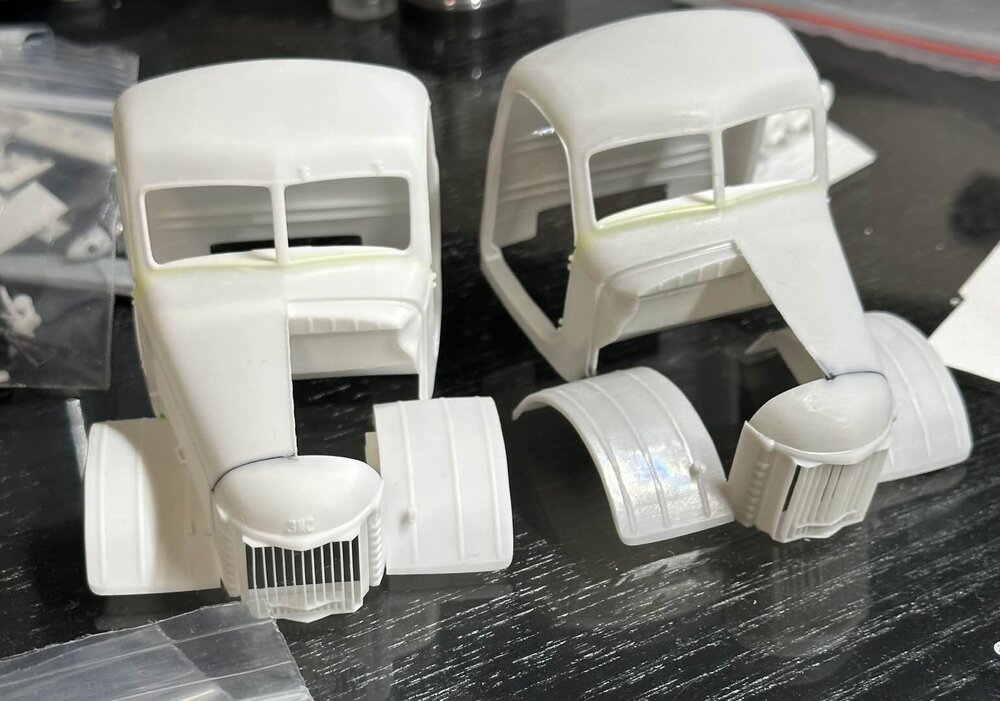 Доброго здравия, коллеги! В этой теме попробую собрать сразу несколько грузовиков, 3D–файлы которых любезно предоставил Дмитрий (наш samdim). Мне представляется что сборка будет не из лёгких: нет инструкций, нет декалей, нет опыта сборки модели в столь крупном масштабе, если не считать эпопею с будкой. С тех пор я, правда уже научился нажимать на кнопку пуска 3Д принтера, да так, что сменил уже два экрана. Ладно, ближе к делу. У меня есть файлы на КУНГ, на какой-то сильно современный кузов (явно не 50-х годов) и на цистерну, фото которой я так и не нашел в Сети. Все эти полезные вещи можно взгромозти на общую раму, где впереди торчит кабина ЗиС-151. И - да - если получится, попробую собрать их в двух масштабах: в 35-м и 72-м. Начну пожалуй с того, с чего начинается любая стройка 3D-модели - с растишек на столе, что был снят только что с консоли принтера. Этот принт не первый, он первый, где я догадался его сфотографировать: Дальше были кабины. Вернее КАБИНА - она одна и, чтобы как-то разнообразить готовые модели, одну из них я отзеркалил, убрав надпись 'ЗиС' на капоте, а другой (третьей) просто закрыл капот. Дело в том что файл изначально был без левой створки капота; она шла отдельной деталью. Вот и будет у меня три машинки: с левой открытой створкой, с правой открытой створкой и просто нормально закрытый капот. Вот сейчас пишу эти строки и, думаю - пожалуй я напечатаю себе ещё одну кабину, потому что на этих принтах сильно видны слои печати на крыльях. Особенно это видно на одной из них (первый снимок - правая). Надо как-то по-другому её спозиционировать. Ну а на сегодня пожалуй всё. Скоро будет продолжение.