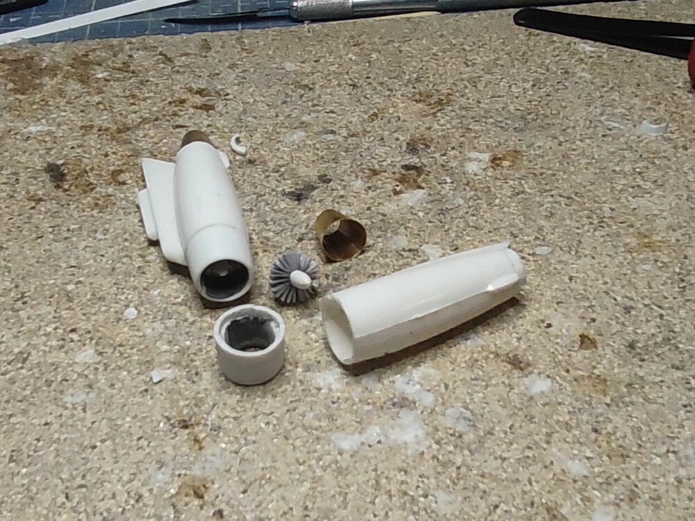 Запылился уж пепелац... Пока я по командировкам шастаю... Двигатели давно собраны, готовы под покраску (расшивку ещё предстоит восстановить). Каналы ВЗ из дошипластика на макросъёмке кажутся толстоватыми, но у меня доступных способов восстановления каналов больше не было.