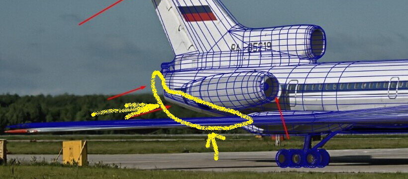Если получилось поймать все параметры, модель правильная, и фото без паразитных искажений - то совпадения полные, расхождения не будет. Примеры есть. Особенно, если это свежая цифровая фотосессия одного объекта, отснятая с разных ракурсов одним фотоаппаратом. Но такие удачи редкие. Чаще всего попадания в одно отдельное фото малоинформативны. Но когда линия, проверенная по множеству ракурсов лежит, усредненно - есть гарантия, что она идет правильно Поэтому, когда у нас в работе очередной самолет и он доводится по фотосовмещениям - практически всегда обнаруживаются разной степени расхождения с имеющимися чертежами. При этом ситуации, когда чертежи бы оказались точными, не было никогда. Точные чертежи на технику видимо где-то существуют, но обычному населению малодоступны или недоступны вообще. Для примера - уже после того, как была выверена болванка, посмотрел, как она соотносится со схемой, которую давал Владимир (scorin) - совпадение по линии хвоста практически полное. При этом специально под нее я вообще ничего не подгонял, просто посмотрел результат Расхождения с чертежом получились такими. Это я скриншоты делал еще до выставления окон и дверей. По ним тоже расхождения присутствуют